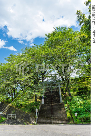 (鳥居)夏の光芒に映える幸福神社(岡留稲荷神社)と岡留公園広場風景(球磨郡あさぎり町)