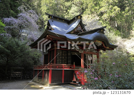満開の桜とシャクナゲのピンクの花に彩られた春の茨城県の花園神社の拝殿