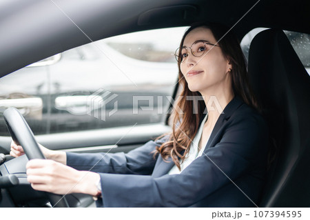 OKポーズをする車に乗ったスーツ姿の若い女性