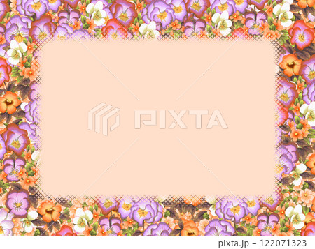 オレンジとピンクと白のスミレが敷き詰められた花柄イラストのフレーム