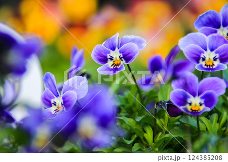 春の花壇に咲くビオラの花