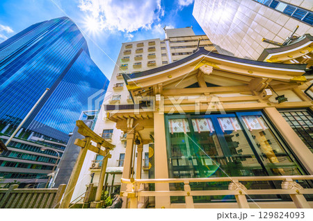 日本の東京都市景観 高輪ゲートウェイシティ前の稲荷神社などを望む