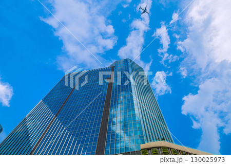 日本の東京都市景観 航空機通過…猛烈な暑さ、発達した雲が高輪ゲートウェイシティ上空に…=8月21日