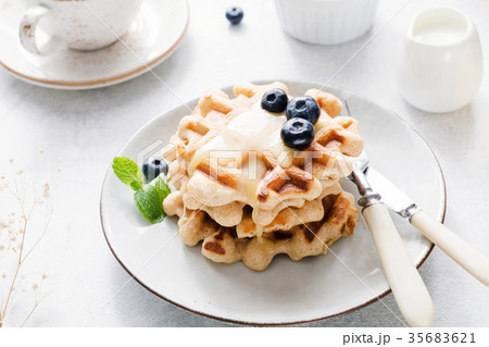 Belgian waffles with cream honey and blueberries