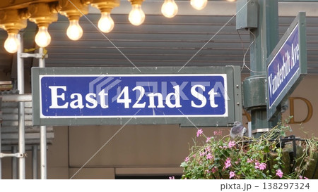 Road sign near Grand Central Terminal, 42 street New York Manhattan, USA. Railway building entrance.