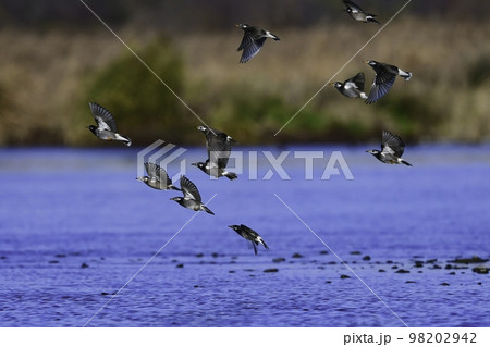早朝の川へ水飲みにやってきた身近な野鳥ムクドリの群れ