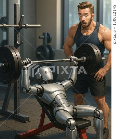 近未来のロボットがジムでベンチプレスに挑戦する驚きの光景