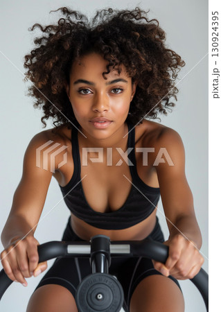 Sportive Latina girl doing spin bike exercises in well-equipped gym