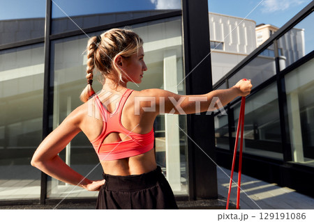 Workout focused sport woman performs stretch exercise with resistance band enjoying outdoor urban training for strong healthy body continuing her fitness workout.