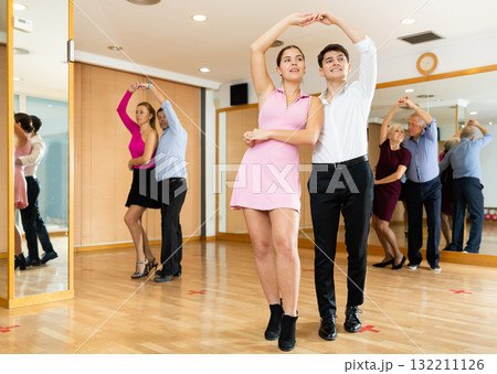 Group of happy multi generation women in sportswear performing dynamic dance moves in gym studio