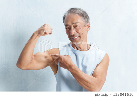 スポーツジムでダンベルを持ち笑顔で筋力トレーニングをする元気なシニア男性