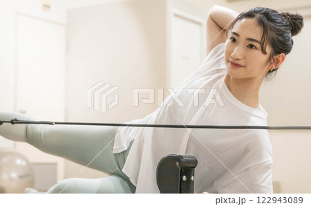 Woman practicing pilates on a reformer machine in a bright fitness studio