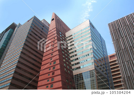 [東京・新宿] ビジネスと経済を象徴する西新宿のビル群のファサードのクローズアップ。