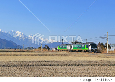 大糸線 リゾートビューふるさと 冠雪した白馬連峰