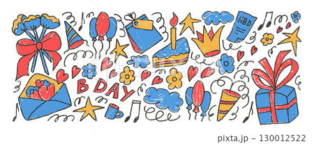 Happy birthday party crayon drawn set. Celebration Bday colorful doodle isolated on white background. Gift, confetti, cakes with balloons for festive. Vector scribbles elements illustration by pencil
