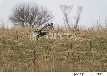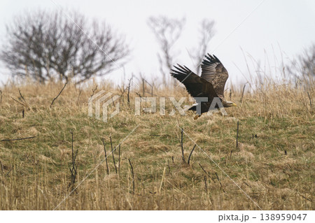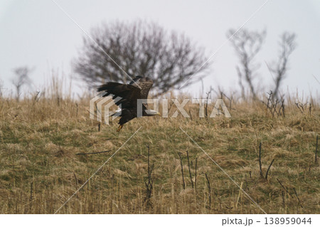 北海道道東 海岸線の荒野を飛ぶオジロワシ 野生の猛禽類