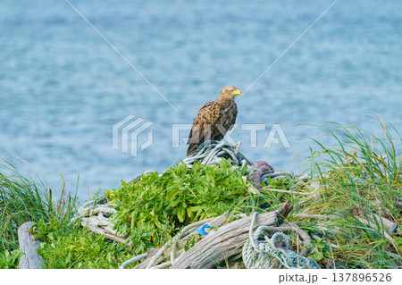 北海道野付半島の海岸に立つオジロワシ 雄大な野生動物の姿