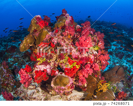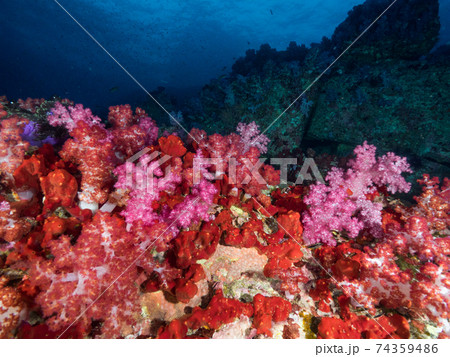ピンク色のソフトコーラルと赤い海綿の群生 (メルギー諸島、ミャンマー)