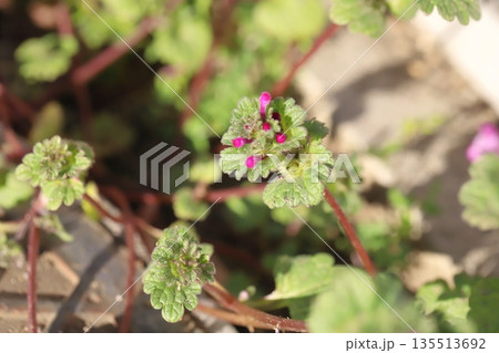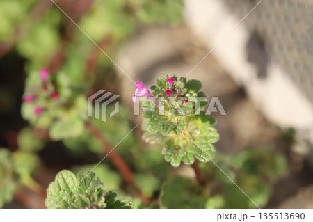 冬の道端に咲くピンク色の小さなホトケノザの花