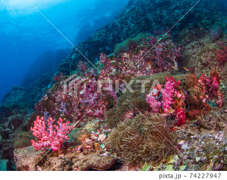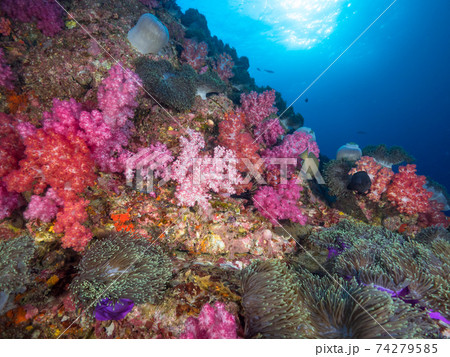 色鮮やかなソフトコーラルの群生 (リチェリューロック、スリン海洋国立公園、タイ王国)