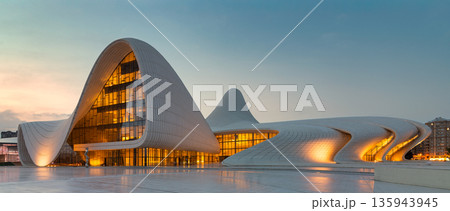 Illuminated Heydar Aliyev Center modern architecture at sunset Baku Azerbaijan