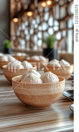 A steaming bowl of dumplings topped with fresh green onions served with chopsticks on a rustic wooden table. Perfect for food blogs, cookbooks, and Asian-themed projects.