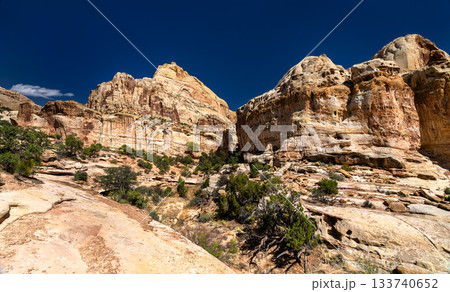 Scenic view of white Navajo Sandstone domes along Hickman Bridge Trail in Capitol Reef National Park. Green juniper trees dot rocky landscape under deep blue sky