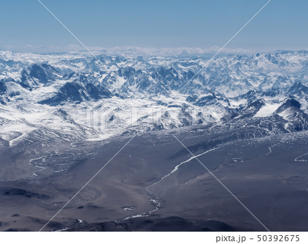 The Kunlun Mountain Range in the Tibetan Plateau in China. View from a high altitude from under the wing of an airplane from the window