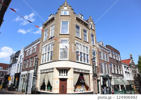 typical century Dutch door holland view in a fortified town with brick houses and front flower gardens. Typical dutch door