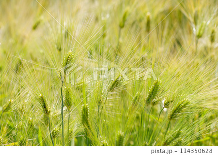青々とした若い大麦の穂ガ風になびく風景(自然光+マクロ接写写真)