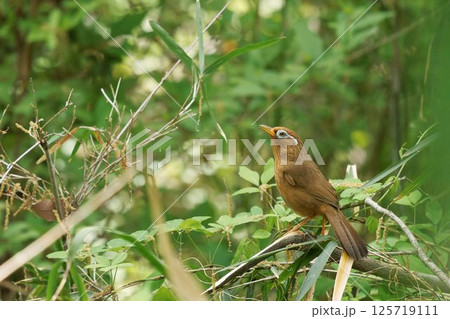 藪や雑木林で大きな声で鳴く茶褐色で白いアイリングの鳥ガビチョウ