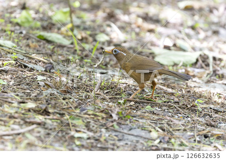 地面の餌を探すガビチョウ