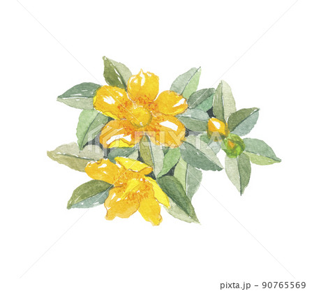 水彩で手書きした花:複数:金糸梅(キンシバイ)の花言葉「きらめき」「悲しみをとめる」「太陽の輝き」