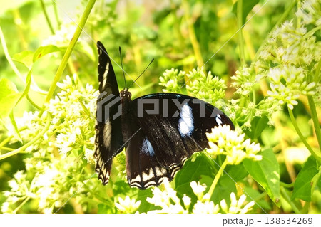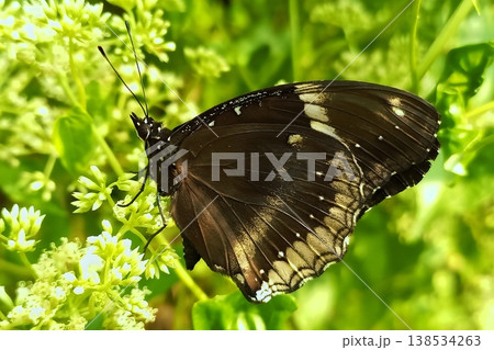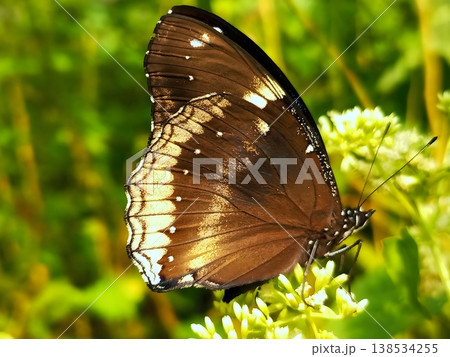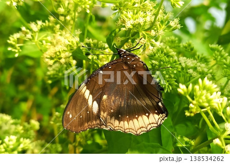 Great eggfly butterfly perched on mikania micrantha flower in natural environment