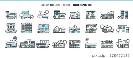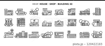 家、店舗、ビルディング、公共施設などシンプルデザインのアイコン素材セット