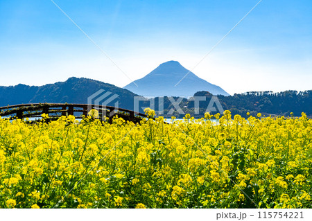 【指宿市 霧島錦江湾国立公園「池田湖」菜の花畑越しに南の開聞岳(薩摩富士)を望む】