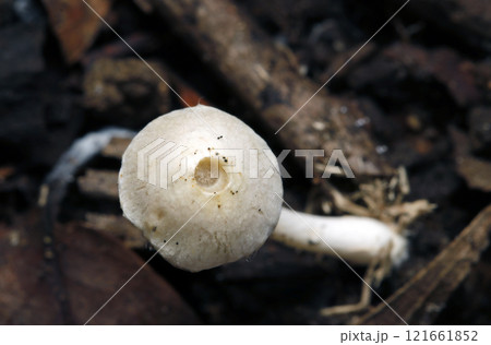 中心が陥没してしまったシロトマヤタケキノコ(自然光+ストロボマクロ接写)