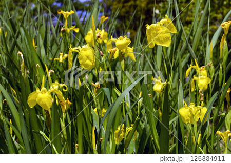 Yellow flag iris is in flower.