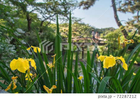 日本庭園の小川の辺に咲く黄菖蒲 (三渓園、横浜、神奈川県)
