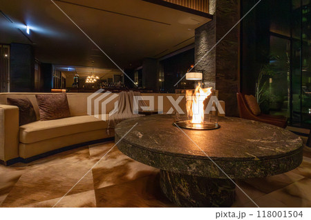 北海道 ニセコのリゾートホテル、東山ニセコビレッジ、リッツ・カールトン・リザーブ 夜のロビーラウンジ