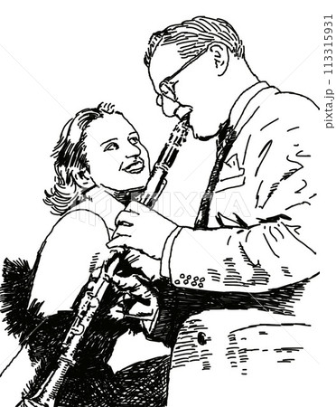 ジャズクラリネット奏者と女性歌手、線画
