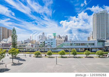 青空が広がるJR清水駅東口前から見たJR清水駅とみなと口広場と高層ビルの風景(静岡県)