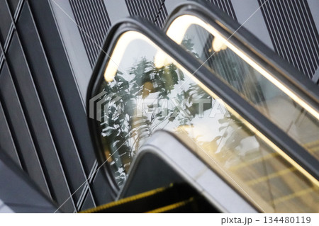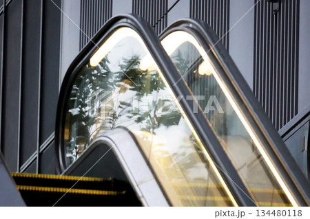 商業施設ビルの間に設置されている屋外のエスカレーター