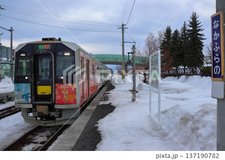 冬の富良野線 中富良野駅と到着する列車(北海道中富良野町)