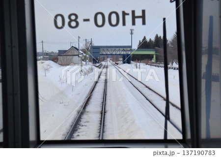 冬の富良野線 上富良野駅へ入線する前面展望(H100形気動車)