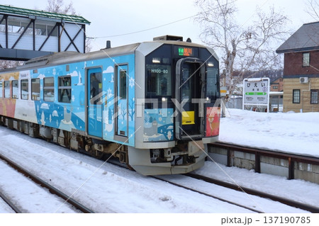 冬の富良野線 美瑛駅と発車する旭川行き列車(北海道美瑛町)