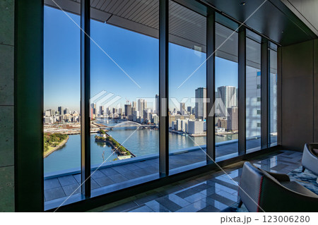 マリオット系のラグジュアリーホテル、メズム東京のフロント、ロビーから築地市場方面を見る