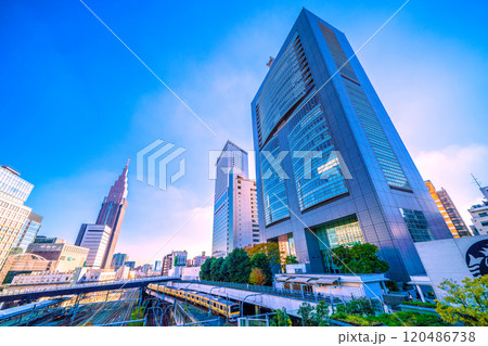 日本の東京都市景観 新宿駅新南口側からNTTドコモ代々木ビルや代々木駅、黄色い電車など望む=22日