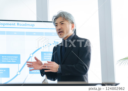 大画面モニターの前で説明するミドルエイジ男性ビジネスパーソン