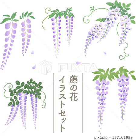 藤の花のフラットイラストセット|春・初夏の和風植物素材集